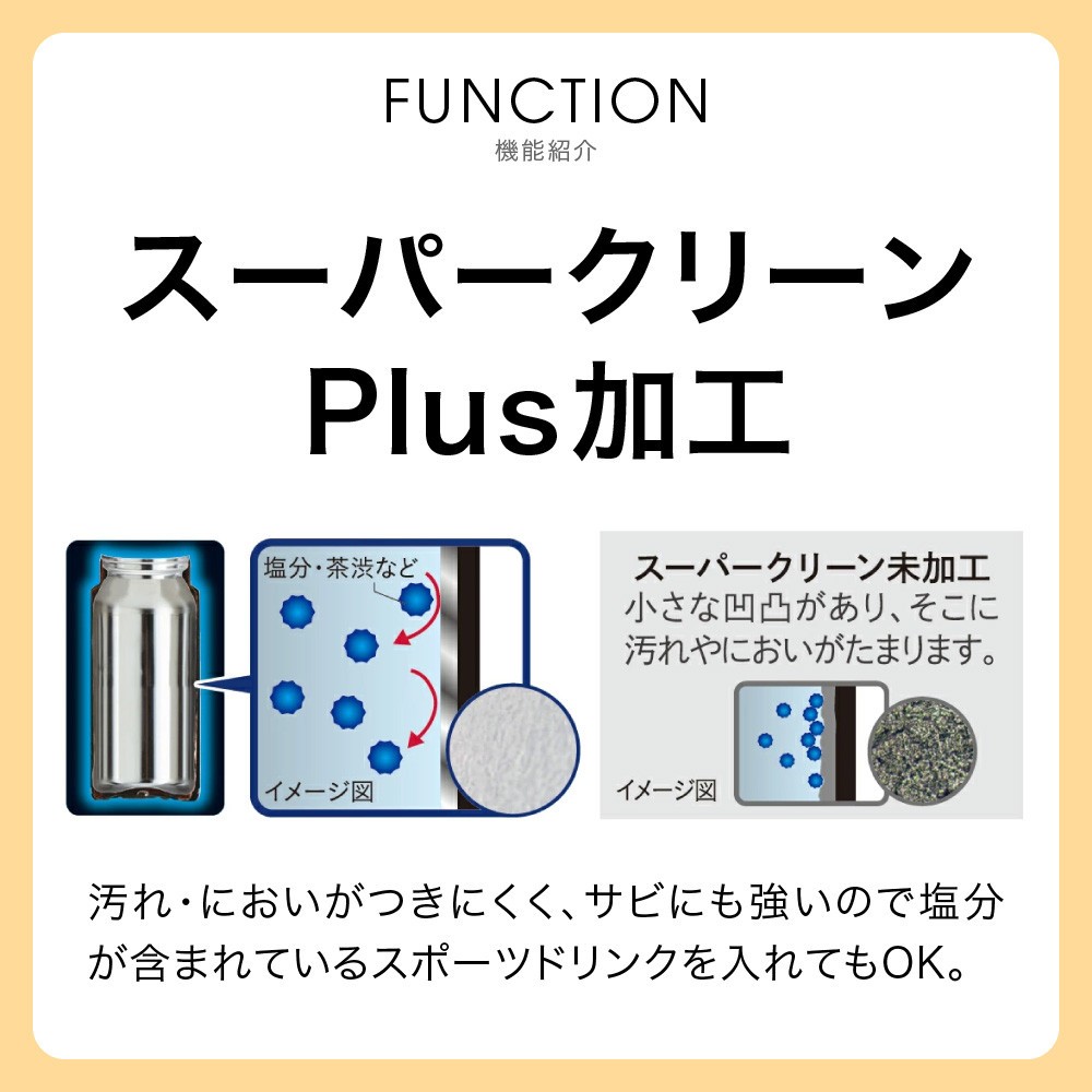 ボトルの内面には、なめらかで光沢のあるスーパークリーンPlusを施しました。汚れ・においがつきにくく、サビにも強いので塩分が含まれているスポーツドリンクを入れてもOK。(使用後はすぐに水ですすぐなど、お手入れしてください。)