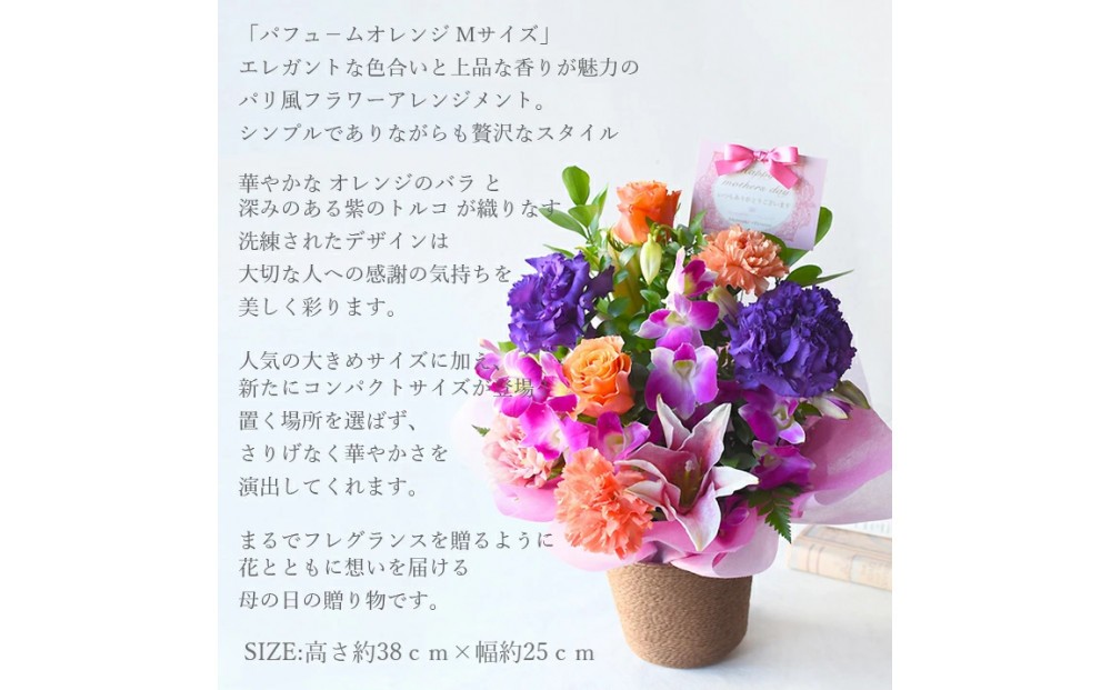 カラーセンスが光る上品なアレンジ当店母の日イチオシ 【母の日】パフュームオレンジMサイズ<お届け日:2026年5/8~5/10 当店おまかせ >母の日カード付き【 母の日 ギフト アレンジ 花 贈り物 大阪府 門真市 】