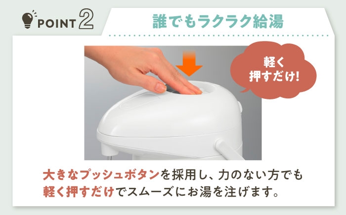 上部のプッシュボタンを押すだけで給湯できる、昔ながらのシンプルで使いやすい「押すだけポット」です。容量はたっぷり入る3.0Lサイズ。家族団らんの食卓や、来客時のお茶出しにも十分な量を確保できます。