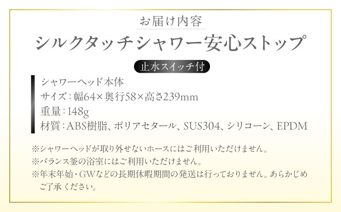 | 容量 | シルクタッチシャワー 安心ストップ シャワーヘッド本体 サイズ:幅64mm×奥行58mm×高さ239mm 重量:148g 材質:ABS樹脂、ポリアセタール、SUS304、シリコーン、EPDM ・シャワーヘッドが取り外せないシャワーホースにはご利用いただけません。 ・バランス釜の浴室にはご利用いただけません。 ・年末年始・GWなどの長期休暇期間の発送は行っておりません。あらかじめご了承ください。 【加工地】 大阪府藤井寺市 |