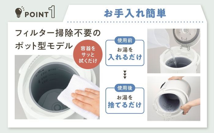 最大の特徴は、フィルターがなく、フッ素加工の広口容器を採用している点です。構造は電気ポットと同じで、フタを開けて水を注ぐだけ。お手入れも容器をサッと拭くだけで完了し、面倒なフィルター掃除や交換の手間がありません。給水も湯捨ても非常にスムーズで、家事の負担を減らしながら清潔な加湿を続けられます。※定期的(1~2カ月に1回)なクエン酸洗浄をしてください。