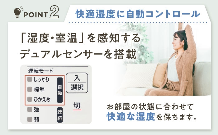 水を沸とうさせ、その蒸気を約65℃まで冷ましてからお部屋へ送り出す「スチーム式」を採用しています。水を加熱するため雑菌が繁殖しにくく、衛生的な蒸気でお部屋を潤します。室温や湿度を感知する「デュアルセンサー」を搭載しており、「しっかり」「標準」「ひかえめ」の3段階から、お部屋の状態に合わせて快適な湿度を自動でコントロールします。
