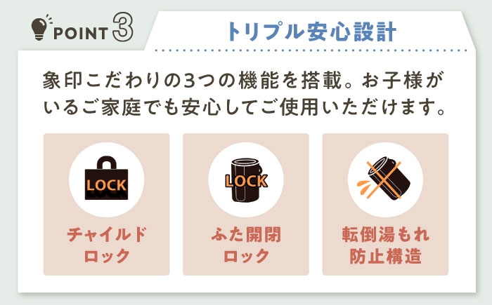 お子様がいるご家庭でも使いやすいよう、「チャイルドロック」「ふた開閉ロック」「転倒湯もれ防止構造」の3つの機能を搭載しました。また、就寝時などに沸とう音が気になる場合は「湯沸かし音セーブモード」を使用することで、水の温度をゆっくり上げて音を抑えることができます。入・切タイマーも個別に設定可能です。