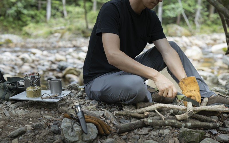 3.2mm 厚のステンレス刃を装着しており、切る・削るはもちろん、バトニングも可能。