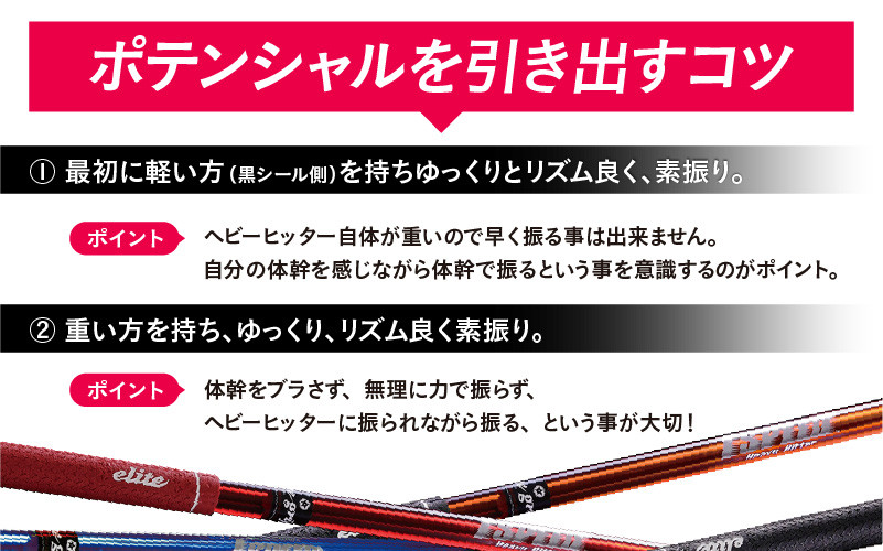 ヘビーヒッター自体が重たいので早く振るという事が出来ませんので体幹を意識しながら体幹で素振りしてください。