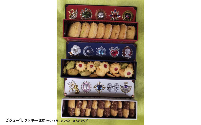 可愛いビジュー缶に入ったオリジナルクッキーの詰め合わせです クッキー缶3本セット(ガーデン&スール&カデット)- 美味しくてビジュー缶が可愛い!プチギフトにお勧め!