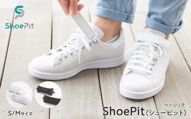 ShoePit(シューピット)は、市販のひも靴に取り付けるだけで、ひも靴からテープ靴に早変わりし、誰でもカンタンに片手で靴の脱ぎ履きができてしまうアイデア商品(特許取得済)です。
