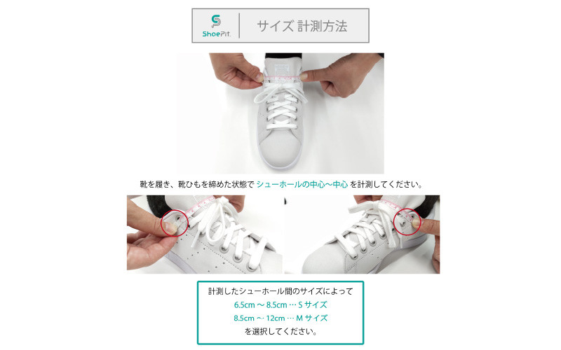 ※ご購入前に必ず、靴ひもをきちんと締めた状態で、装着するシューホールとシューホールの間の寸法を計測して、下記よりサイズを選択してください。