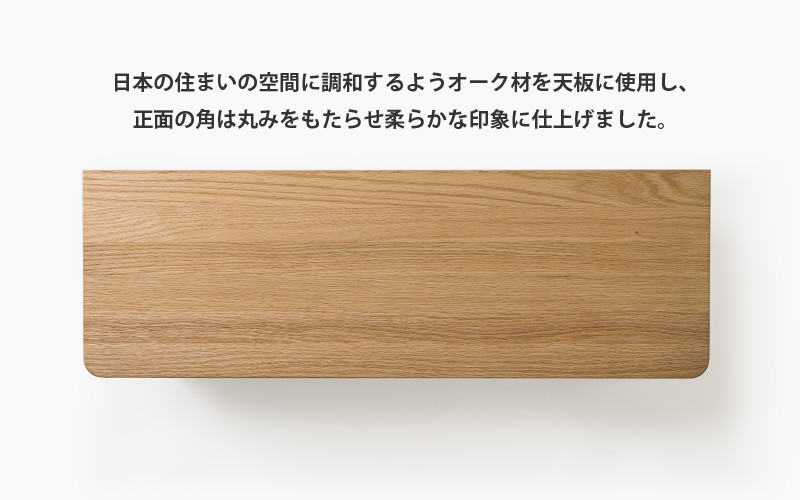 本体は艶を抑えたマットな質感が特徴で、日本の住まいに調和するようオーク材を天板に使用し、正面の角は丸みをもたせて柔らかな印象に仕上げました。