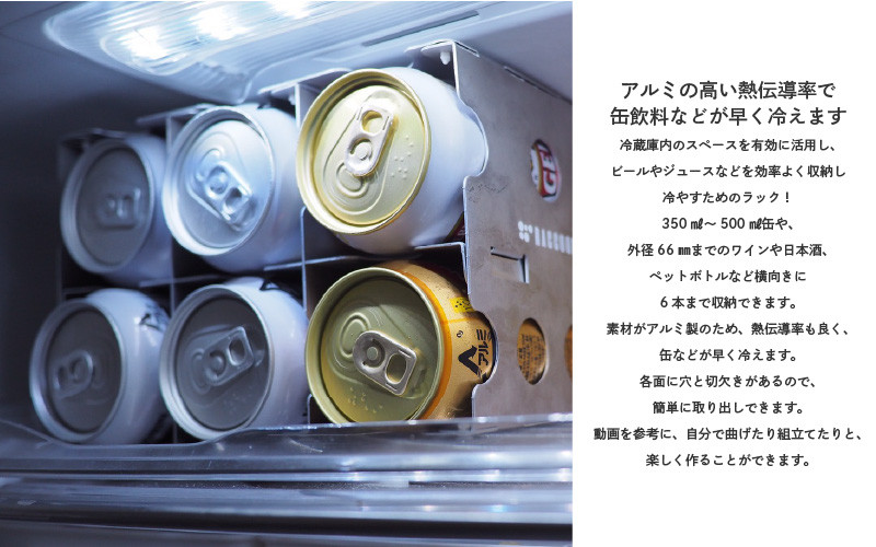 冷蔵庫内のスペースを有効に活用し、ビールやジュースなどを効率よく収納し冷やすためのラック!