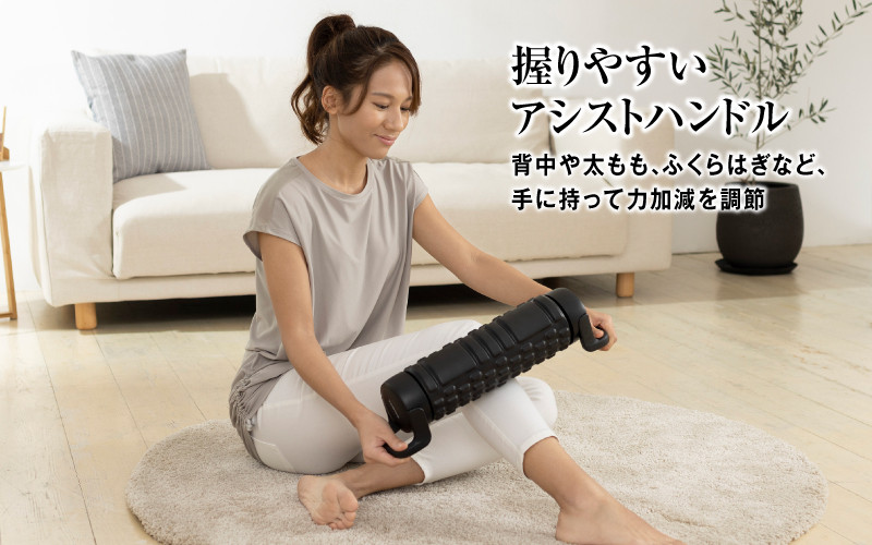 握りやすいアシストハンドルは、背中や太もも、ふくらはぎなど、手に持って力加減を調節でき、床に置いても安定するので部位をローラーに乗せるだけで負担も少なく気軽にボディケアできます。