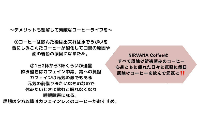 NIRVANA Coffeeとは仏教用語で涅槃(ねはん)とコーヒーを合わせたことで、煩悩が消える意味から、お客様がこのコーヒーを香り、飲むことで欲や悩みなどがひとときの間、消えることを思想とします。