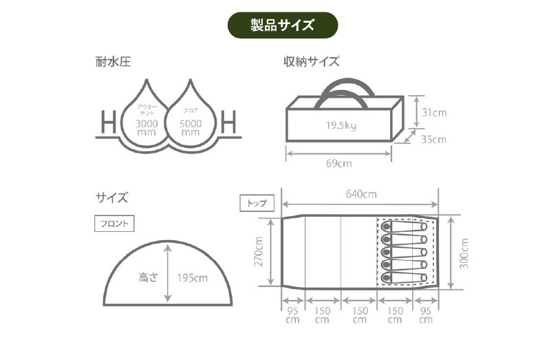 | 容量 | ◆商品内容◆ ────────────── ■カマボコテント 3M 種類をお選びください。 ・T5-689-TN ・T5-689-BK 【セット内容】 アウターテント、インナーテント、ロープ×16本(うち8本はテントに取り付け済)、ポール×4本、リペアポール、キャリーバッグ、リペアシート、タイベルト×2本、ペグ×28本、ポール用キャリーバッグ、ペグ・ロープ用キャリーバッグ 【サイズ】 ・組立サイズ(外寸):(約)W300×D640×H195cm ・インナーサイズ:(約)W280×D220×H170cm ※インナーテントのドア面がW ・収納サイズ:(約)W69×D35×H31cm ・総重量:(約)19.5kg 【素材】 ・アウターテント:150Dポリエステル(PUコーティング、UVカット加工) ・フレーム:アルミ合金 ・インナーテント壁面:68Dポリエステル ・インナーテントフロア:210Dポリエステル(PUコーティング) |