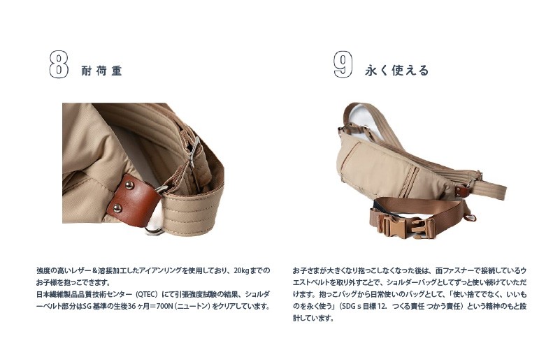 おしゃれなだけでなく、特許も取得している2本のショルダーベルトとウエストベルトでお子さまの荷重を分散するなど、機能面も充実しています。