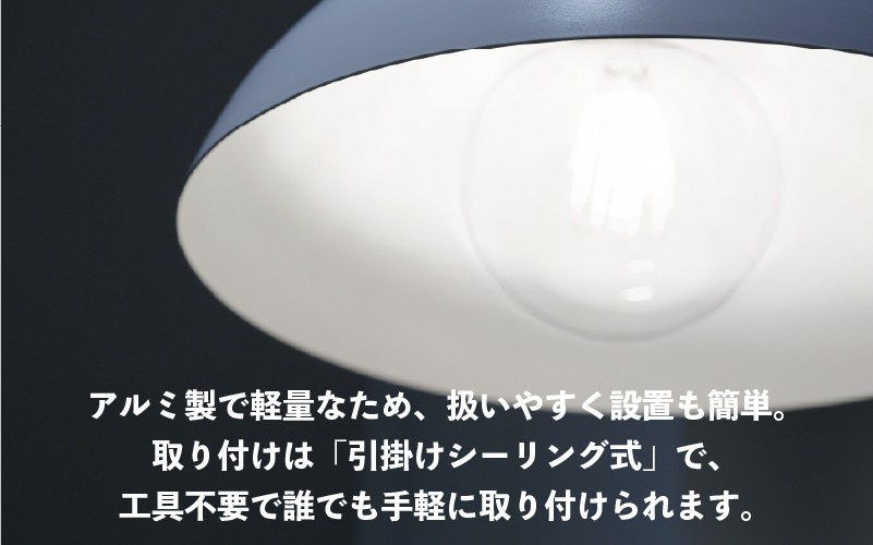 日本の技術力が息づく、大阪府東大阪市で製造されたペンダントライト。 職人の熟練技術である「ヘラ絞り」を活かし、美しく個性豊かなシェードを企画・開発しました。 アルミ製で軽量なため、扱いやすく設置も簡単。取り付けは「引掛けシーリング式」で、工具不要で誰でも手軽に取り付けられます。 シンプルで洗練されたデザインは、リビングやダイニング、カフェなどあらゆる空間に溶け込み、上質で落ち着いた雰囲気を演出します。