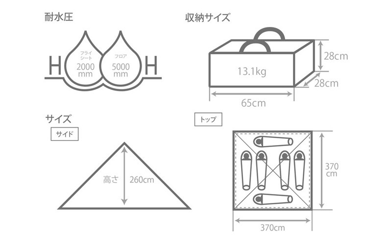 | 容量 | ◆商品内容◆ ────────────── ■ ワンポールテント RX (L) カラーをお選びください。 ・( T6-817-KH ) ・( T6-817-TN ) 【セット内容】 フライシート、インナーテント、ポール、ペグ×16本、ロープ×8本、キャリーバッグ、コンプレッションベルト×2本 【サイズ】 組立サイズ(外寸):(約)W370×D370×H260cm インナーサイズ:(約)W350×D350×H260cm (約)13.1kg 【素材】 フライシート:150Dポリエステル(PUコーティング、難燃加工) インナーテント:68Dポリエステル フロア:210Dポリエステル (PUコーティング) ポール:スチール |