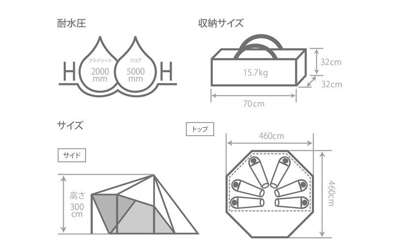 | 容量 | ◆商品内容◆ ────────────── ■ヤドカリテント カラーをお選びください。 ・(T6-662-GY) ・(T6-662-TN) 【セット内容】 フライシート、インナーテント、ポール、ロープ×12本(うち8本はテントに取り付け済)、ペグ×19本、ポール用バッグ、ペグ用バッグ、タイベルト×2本、キャリーバッグ ※タープスペース跳ね上げ用のポールは別売りです。 【サイズ】 組立サイズ(外寸):(約)W460×D460×H300cm インナーサイズ:(約)W430×D290×H300cm 収納サイズ:(約)W70×D32×H32cm 【素材】 フライシート:150Dポリエステル(PUコーティング) ポール:スチール インナーテント:ポリコットン(ポリエステル65%、綿35%) フロア:210Dポリエステル(PUコーティング) |
