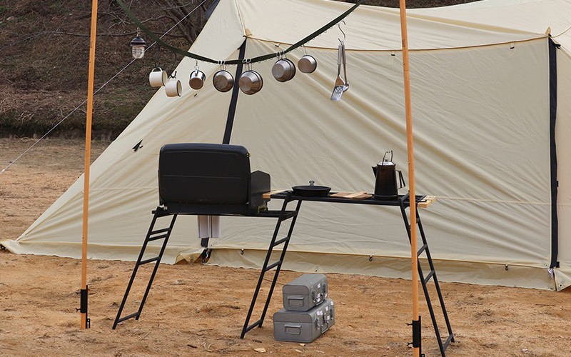 ワンポールテントの中心に。みんなで囲める大型テーブル。