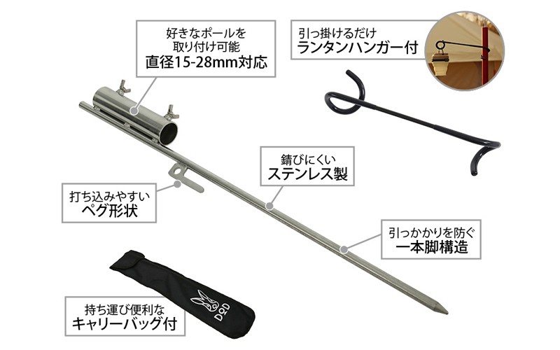 ハンマーでペグを打ち込み、別売りのテント用ポールを挿入することで、スマートな一本脚のランタンスタンドとなります。