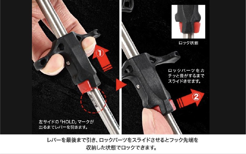 また、ロック機能があり、フック先端が収納でき、ネットや服に引っ掛ける心配もなく、持ち運び時のトラブルを防ぎます。