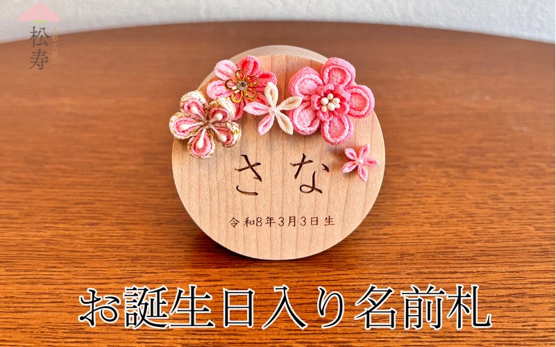つまみ細工のお花がついた松寿オリジナルのお誕生日入りの名前札 雛人形 木製木札 お誕生日入り名前札【松寿オリジナル名前札(丸型小)ピンクタイプ】