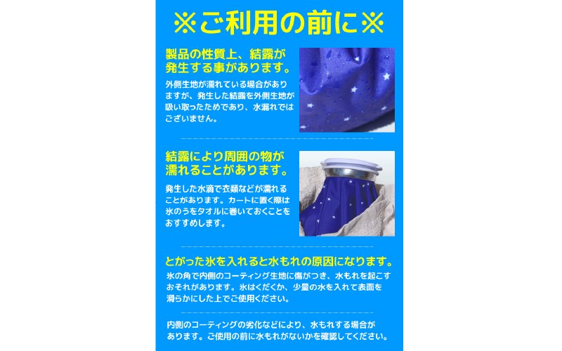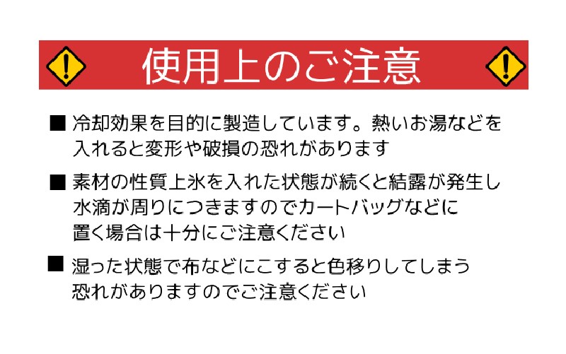 ・素材の性質上氷を入れた状態が続くと、結露が発生し水滴が周りにつきますのでカートバッグなどに置く場合は十分にご注意ください。