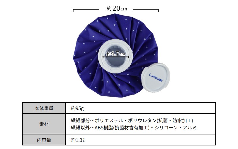 | 容量 | ◆商品内容◆ ────────────── ■LAROUGE(ラルージュ) アイスバッグ(氷のう) 【原材料】 繊維部分…ポリエステル・ポリウレタン(抗菌・防水加工) 繊維以外…ABS樹脂(抗菌材含有加工)・シリコーン・アルミ |