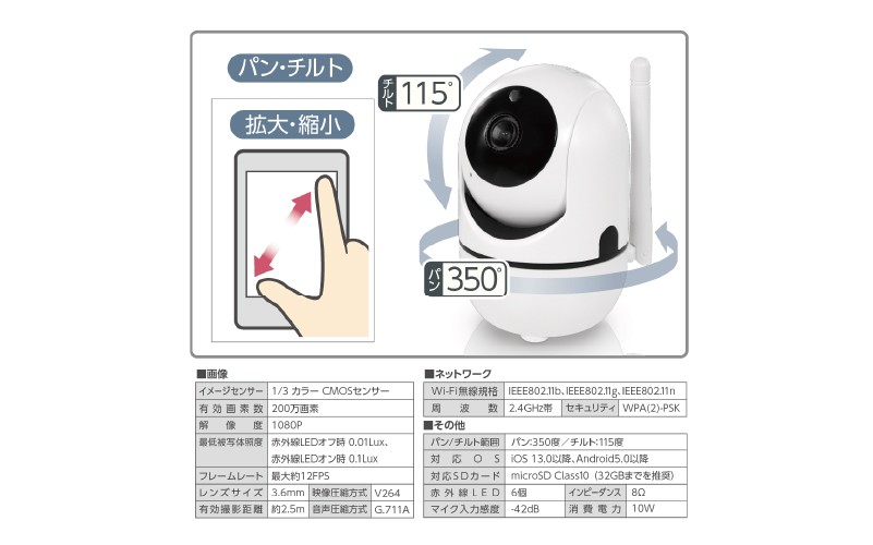 | 容量 | ◆商品内容◆ ────────────── ■Wi-Fiライブカメラ 本体×1個 電源用USBケーブル×1本 固定用アタッチメント×1セット 約160g(本体) 約250g(箱込) 【ネットワーク】 周波数:2.4GHz帯 【画像】 画素数:200万画素 解像度:1080p 映像圧縮方式:V264 【その他】 パン/チルト範囲:パン:約350度/チルト:約115度 赤外線LED:6個 対応SDカード:microSD Class10 (※対応容量/32GB推奨) 電源方式:USB給電 DC5V/2A 消費電力:10W 対応OS:iOS 13.0以降、Android 5.0以降 【素材】 ABS・ガラス・鉄 |