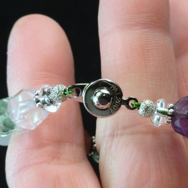 | 容量 | 〈使用している石、部材〉水晶、グリーンフローライト、モスコバイト、ムーンストーン、ローズクォーツ、アメシスト(アメジスト)スモーキークォーツ 天然石の間の飾りは銀製(純度92.5%)です。 石を繋いでいるのはナイロンコートワイヤーです。 留め金はホックのように付け外しできます。 シリコンゴムタイプへの変更も承っております。 〈サイズ〉手首サイズ約17cm サイズ変更はご指定ください。希望の無い場合はそのままのお届けとなります。 プレゼント包装もいたしますので、ご希望の際はお申し付けください。 ※最小サイズは15センチとなります。 |