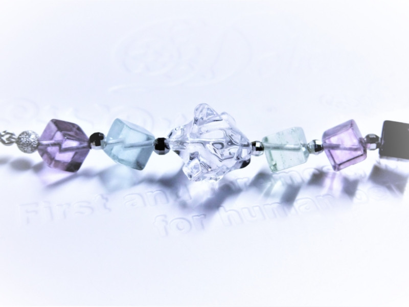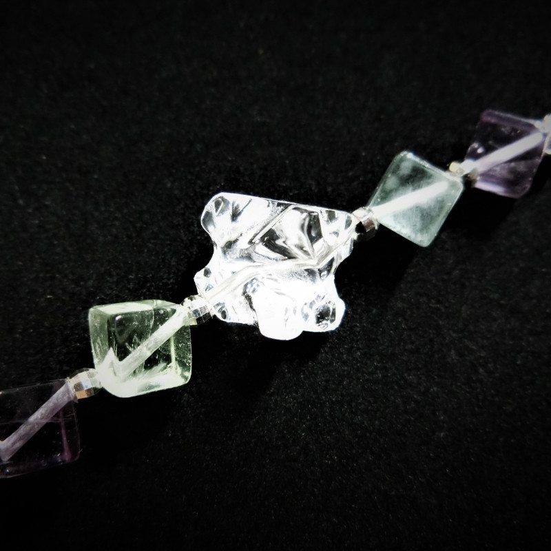 中央に大きく光る透明の「水晶」は場を浄化し、心身共に癒し、危険を避け、幸運を招くと言われています。組み合わせたほかの天然石の力を強力にするパワーがあると言われています。