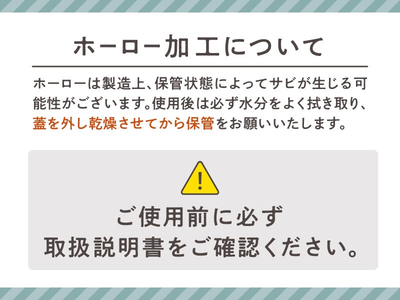 ●ホーローが掛かりにくい端面部には、錆が発生する恐れがございます。水気をとり乾燥させるとある程度の錆びの予防が出来ます。