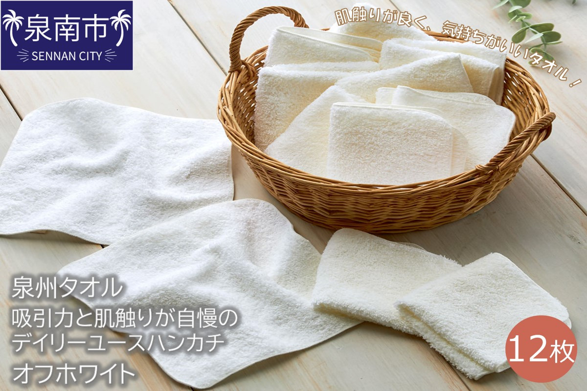 伝統の後晒し製法により仕上げられるタオルは、肌触りの良さと高い吸水性が特徴です 【泉州タオル】吸水力と肌触りが自慢のデイリーユースハンカチ オフホワイト12枚【039E-076】
