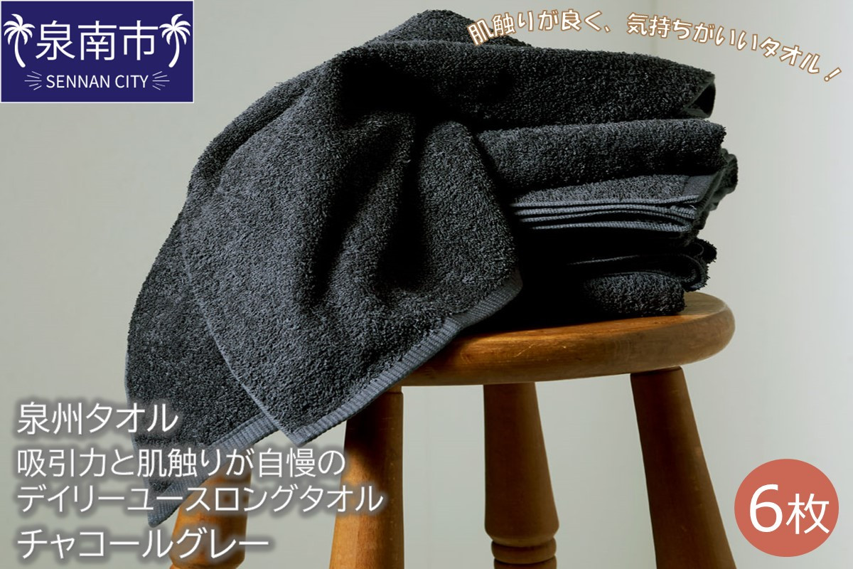 伝統の後晒し製法により仕上げられるタオルは、肌触りの良さと高い吸水性が特徴です 【泉州タオル】吸水力と肌触りが自慢のデイリーユースロングタオル チャコールグレー6枚【039D-148】