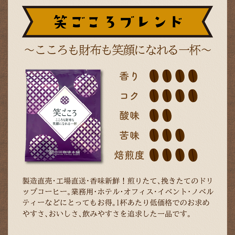 【吉田珈琲本舗】【ドリップコーヒー】笑ごころブレンド 300袋…37,000 円 珈琲の魅力、香り酸味コクを存分にお楽しみください。 - 常温便