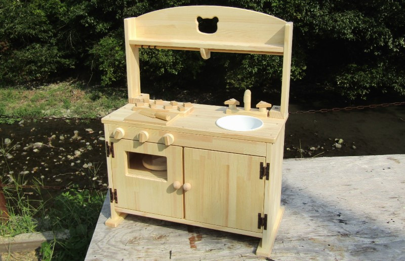 sosion夢工場の大人気モデルのままごとキッチンがパワーアップ! 取り外し可能な上部の棚が付いたフル装備のままごとキッチンです。広い棚の下には、フックが3つ付いていますので、調理器具も付けられます。 また「オープンカフェ風にするならばカーテンを付けても良いかも?そこは、親御さんの出番ですよ(^_-)-☆ もちろん動く蛇口・青と赤で色分けられた「水・お湯』のコックもクルクル回りますし、左のガス用・レンジ用のツマミもクルクル回せますよ(・∀・☆) レンジには手動で回せる「ターンテーブル」付きです。最近のオーブンレンジは、あまり見かけませんが、おもちゃで付いていないと「ただの収納庫」。 これじゃあ、面白くないですよね? また左のレンジ扉を開きますと、下の表からでは見えなかった収納庫がございます。お母さんに見られて困るものも隠しておけるかも? *ただし、お父さんのへそくりは入れないでくださいね。必ず、お母さんに見つかります( ̄^ ̄)」 手作り木工 木のおもちゃ・家具 sosion夢工場では、家のキッチンに出来るだけ近くなるように、また少し面白味もあるようにも心がけています。 これならば「おかあさんと違う~」ってことも少ないかな?決して、お子さんが居ない時に、こっそり大人が遊ばないように(^_-)-☆ では、親御さんは、ゆっくりとお料理ができるのをお待ち下さいね。 包丁・まな板は、標準装備しています。開封して直ぐに調理に掛かれます。 ■地場産品類型:3 泉南市内で製造・加工などの主要な部分を行うことにより、相応の付加価値が生じているもの ■類型該当理由:区域内の工場にて、原材料の仕入れを行い、一つ一つ手作業で製造・加工・梱包・発送の全てを行っている。 ( ふるさと納税 おもちゃ おままごと キッチン 手作り 木製 木のおもちゃ )