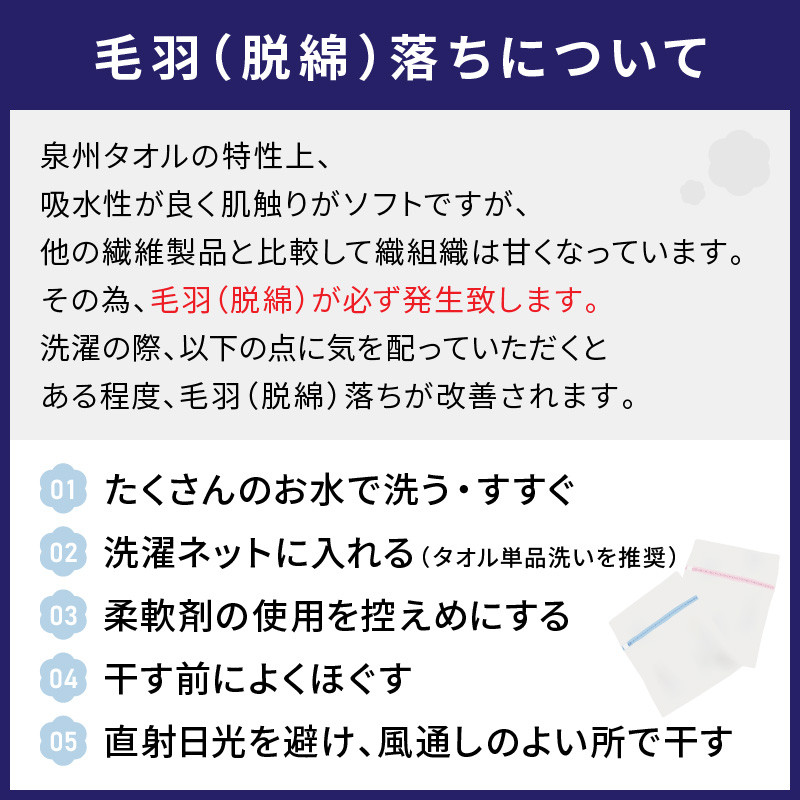 素材はもちろん綿100% 泉州タオルの特徴は、後晒し製法と呼ばれる独特な製法。 糸についた糊(のり)や油分などの不純物をきれいにすべて取り除き、 漂白・水洗いをしていますので、おろしたてのタオルがそのまま使えます。 タオルを一度洗っていただいた方が、より一層ふっくらするので その方がより気持ちがいいように感じると思います。 不純物がなく、お肌の敏感な方や赤ちゃんにおすすめのタオルです。 肌触りと吸水力が自慢の「毎日つかいたくなる 」タオル しっかりした素材感や吸水性、心地いい肌さわりのタオル。 毎日、体に触れる、髪を拭く、顔を拭く、手を拭くそんな何気無い日常を ほんの少し心地良くしてくれるタオルです。 心地いい肌触りは、日々の疲れを癒してくれます。 毎日の日々の中で、ほんの少し贅沢感を味わえるタオルです。 厚みが絶妙なタオル 生地は分厚すぎず・薄すぎずの中厚手。 だからふわふわ感があっても収納にかさ張らず、吸水性がよいのに乾きも早い。 暮らしに身近なものだから“心地よさ” に加え、そうした“使いやすさ”にもこだわりました。 洗うとふかふかボリューム! 新品タオルと洗ったタオルを比較するとボリュームが格段に変わります。 届いたばかりのタオルは、少し薄いかなと感じると思います。 しかし1回洗濯すると毛が立ちふっくらとします。 お洗濯する際は、柔軟剤の使用はお控えください。 タオル本来の吸水性が損なったり、パイルが抜けやすくなる原因になります。 柔軟剤を使用しなくても、ふっくら柔らかくなります。 ※画像はイメージです。 ※お品の色味は、お使いの機器の画面設定、お部屋の照明等の環境により実際の色味と異なる場合がございます。 【配送に関する注意事項】 ※北海道・沖縄県・離島へはお届けできません。 ■地場産品類型:3 泉南市内で製造・加工などの主要な部分を行うことにより、相応の付加価値が生じているもの ■類型該当理由:区域内において、原材料の仕入れから製造・加工・梱包・発送のすべてを行っている。