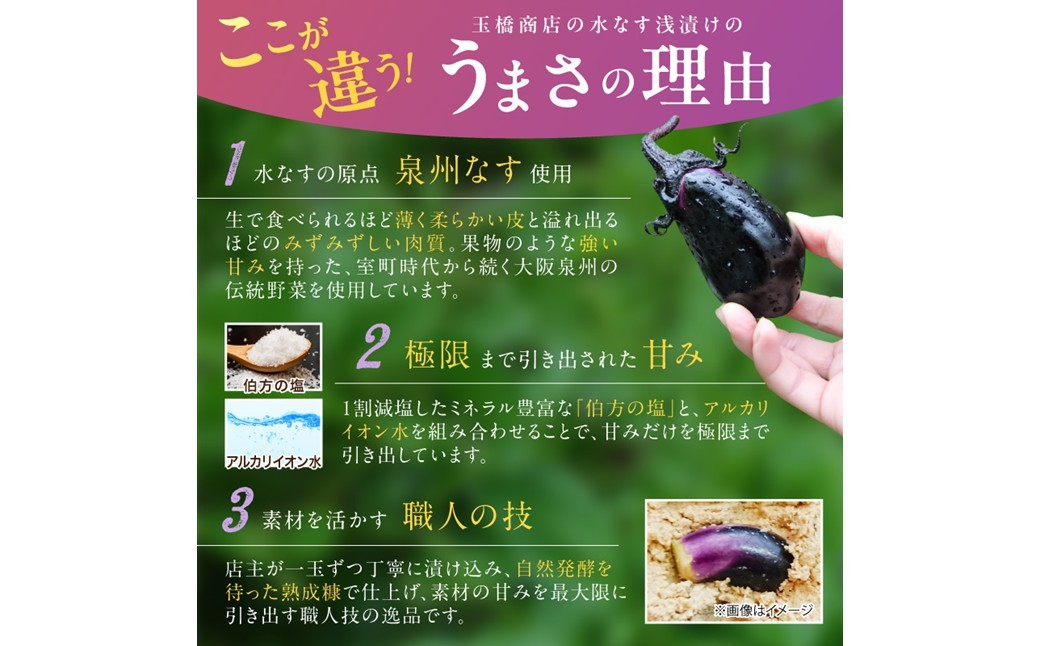 浅漬工房玉橋商店の厳選した『泉州なす』を使った本物の水なすの浅漬けは、当店のオリジナル品です。