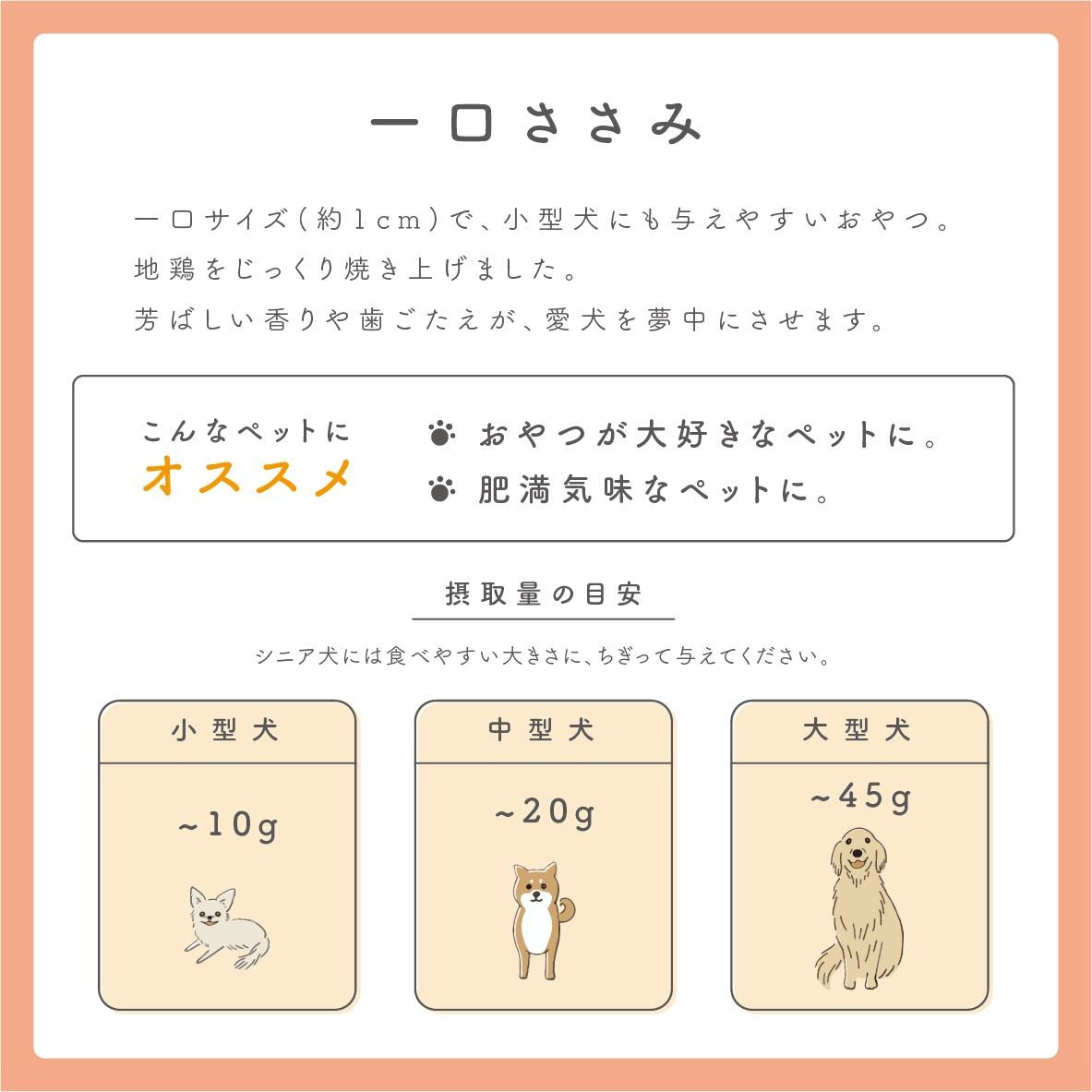 人間が食べられる新鮮な国産若鶏ささみをオーブンで焼き上げ、乾燥させたおやつです。