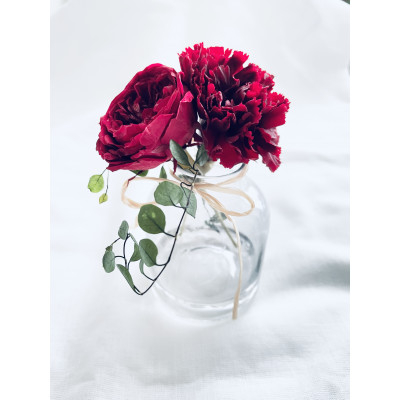 お部屋を選ばずどんなインテリアにもなじむシックな赤いカーネーションとバラは、落ち着いた華やかさがあり、見る人の気持ちを明るくしてくれます。