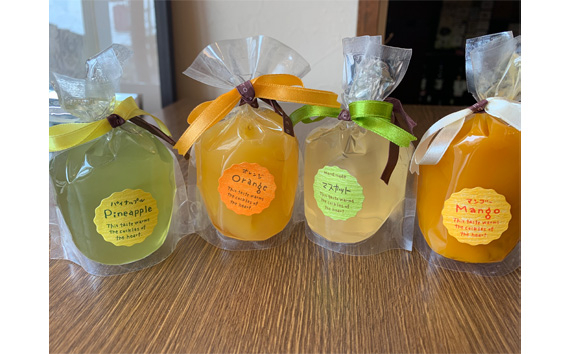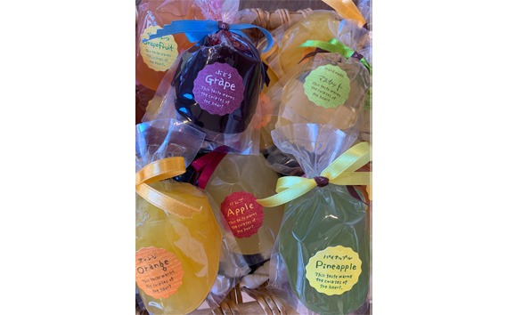 金剛山行者湧き水で作った湧き水ゼリー。オレンジ、ぶどう、マスカット、マンゴー、りんご、桃、グレープフルーツ、パイナップルの8種類の詰め合わせ