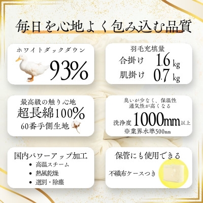 〈超長綿100%60番手生地サテン織〉二枚合わせ羽毛布団 クイーン ホワイトダックダウン93%【1107370】