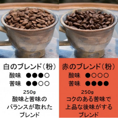 当コーヒー工房の基準点となっているバランスの良い白のブレンドと、深煎りのストロングでキレのある味わいで人気の赤のブレンドのセットをオリジナルの保存缶に入れてお届けいたします。