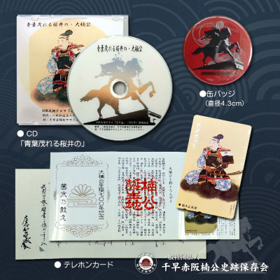 2021年11月に出版した書籍「楠木正成~知られざる実像に迫る~」、ポケットに楠公像をプリントしたミニトートバッグ、楠公兜柄の日本手ぬぐい、楠木正成公と正行公親子の別れを歌った「青葉茂れる桜井の」CD、台紙付きのテレフォンカード、楠公騎馬像の缶バッジといった楠木正成公ファンにはたまらないグッズ6点をセットにしました。