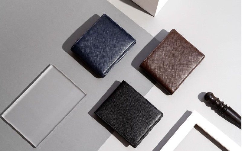 耐久性に優れ、汚れや傷が目立ちにくいサフィアーノ型押しの二つ折り財布と名刺入れ。