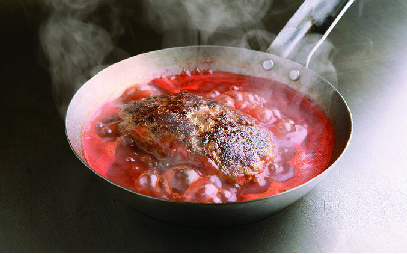 神戸牛と淡路島の玉ねぎのソテーをふんだんに使用した当店のハンバーグは、厚さ25mmの本格ステーキハウス仕様の鉄板で一点一点手作業で焼成をし、特製のデミグラスソースでコトコト煮込んだこだわりハンバーグです。
