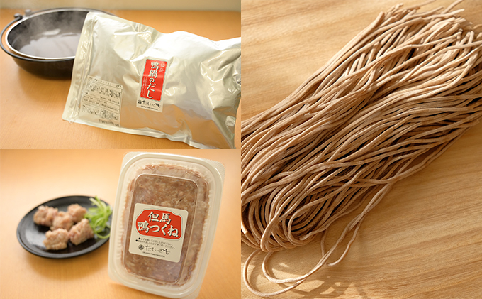 但馬鴨のガラでとった透きとおる秘伝の「鍋ダシ」、「但馬鴨つくね」、鴨との相性抜群の「出石そば」の計4点セット。