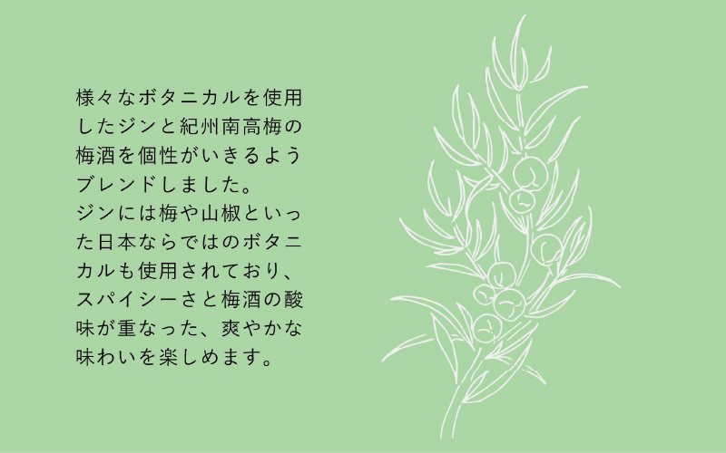 様々なボタニカルを使用したジンと紀州南高梅の梅酒を個性がいきるようブレンドしました。