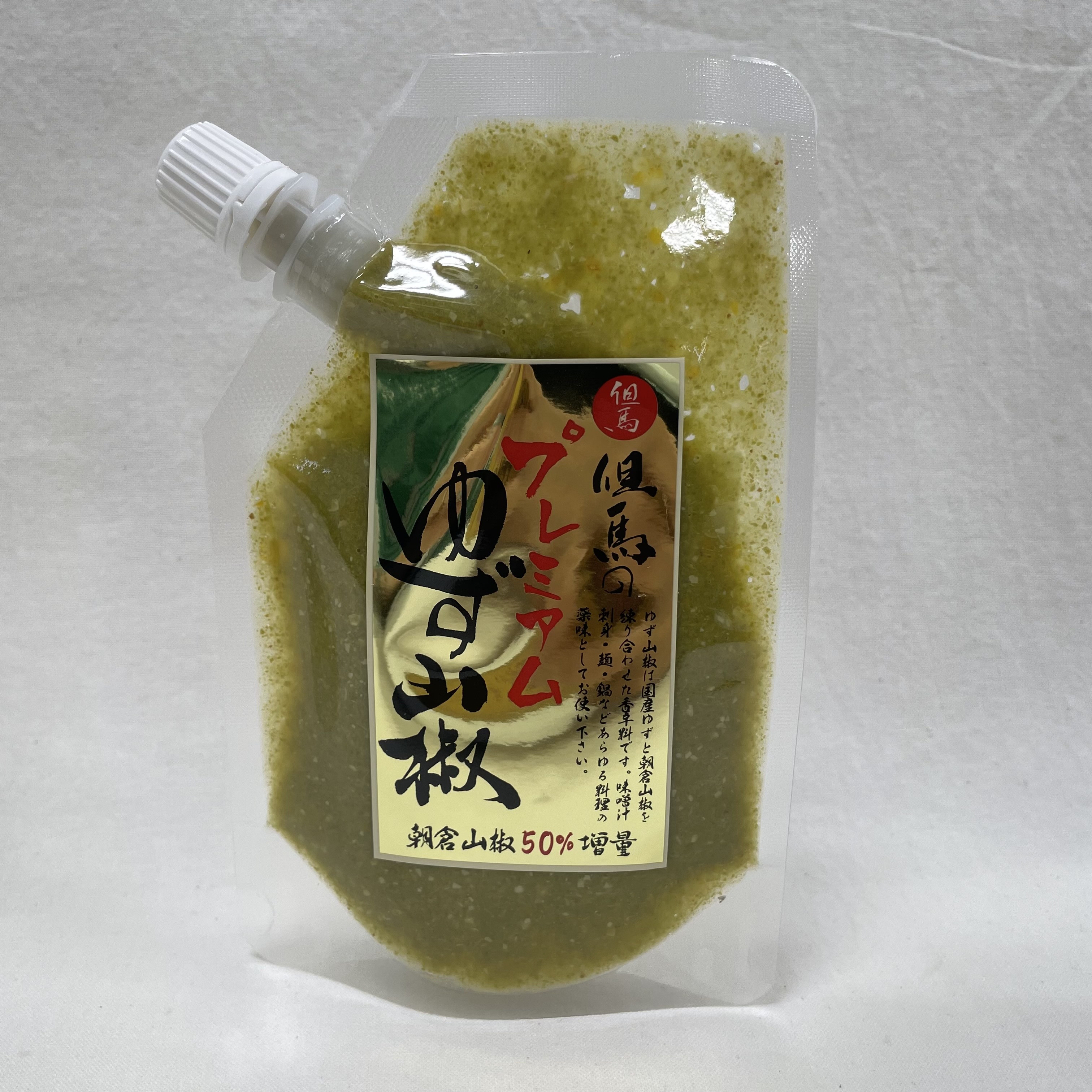 プレミアムゆず山椒:但馬のゆず山椒と比べて但馬産朝倉山椒を50%増量。大人の味に仕上げました。