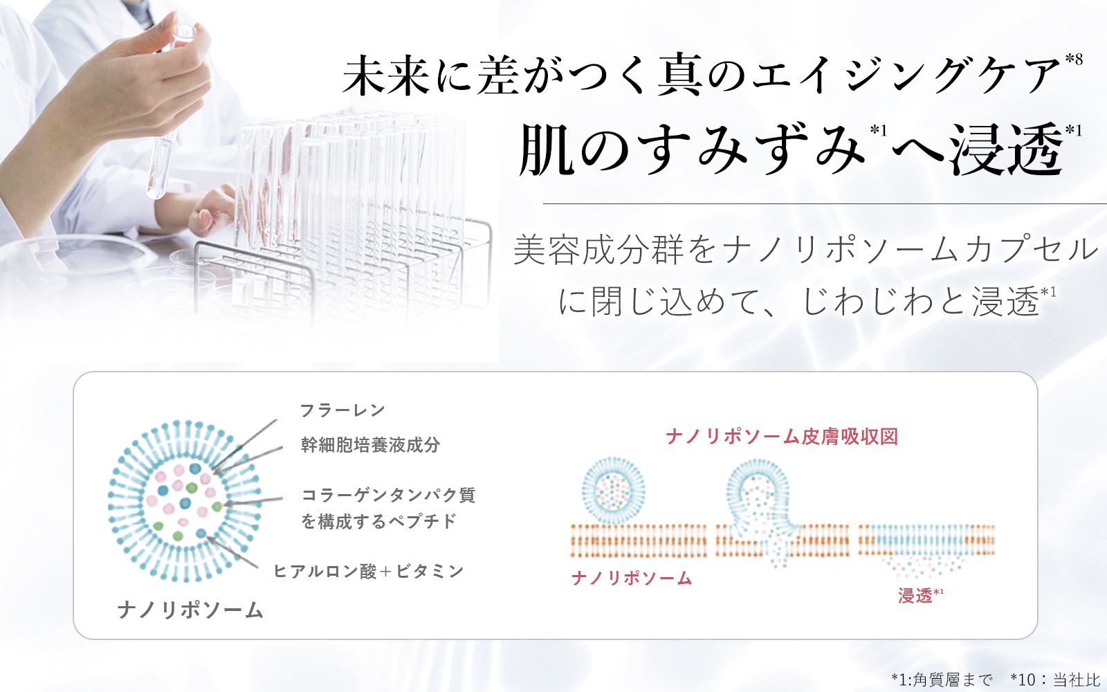 浸透*1に着目したエイジングケア*8 先行美容液。ノーベル化学賞受賞研究で発見された「フラーレン*」を高濃度配合。※三菱商事サイエンス社のフラーレン高濃度証明「RSマーク」取得