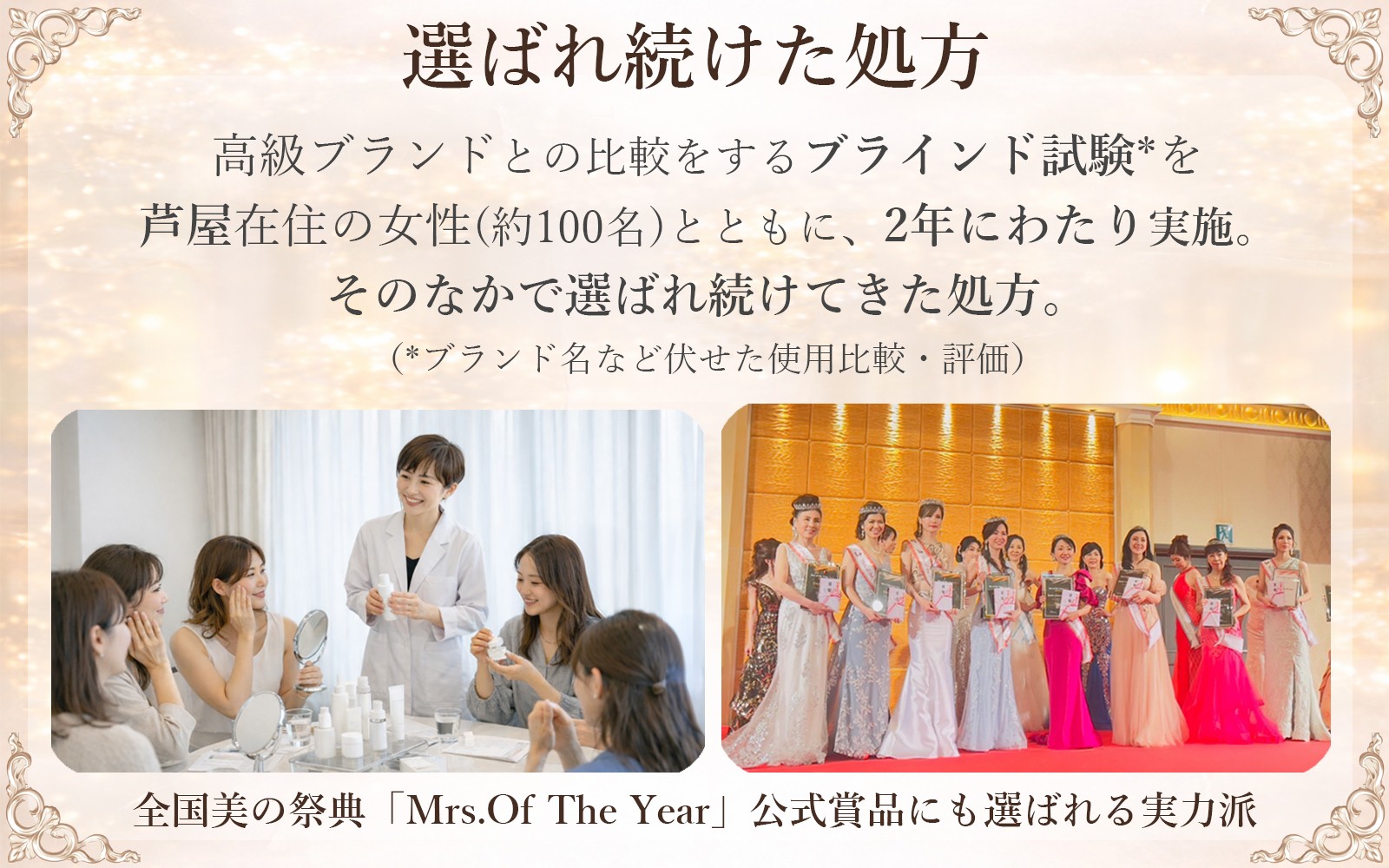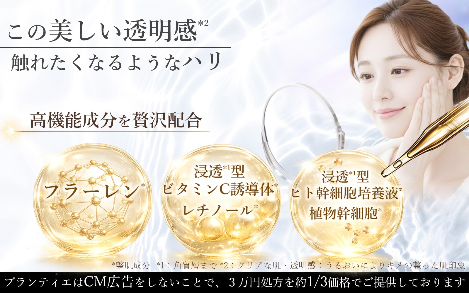 「結局、化粧品は何を使っても変わらない...」そんな違和感からブランティエは生まれました。さらに、国内外の高級化粧品に触れてきた芦屋在住の女性約100名による特殊なブラインド試験を2年にわたり実施し、高級ブランドと同等水準の処方が完成しました。「本物を知ってほしい。」という思いから、CM広告を行わないことで、高級ブランド発想の処方を、手に取りやすい価格で実現しました。